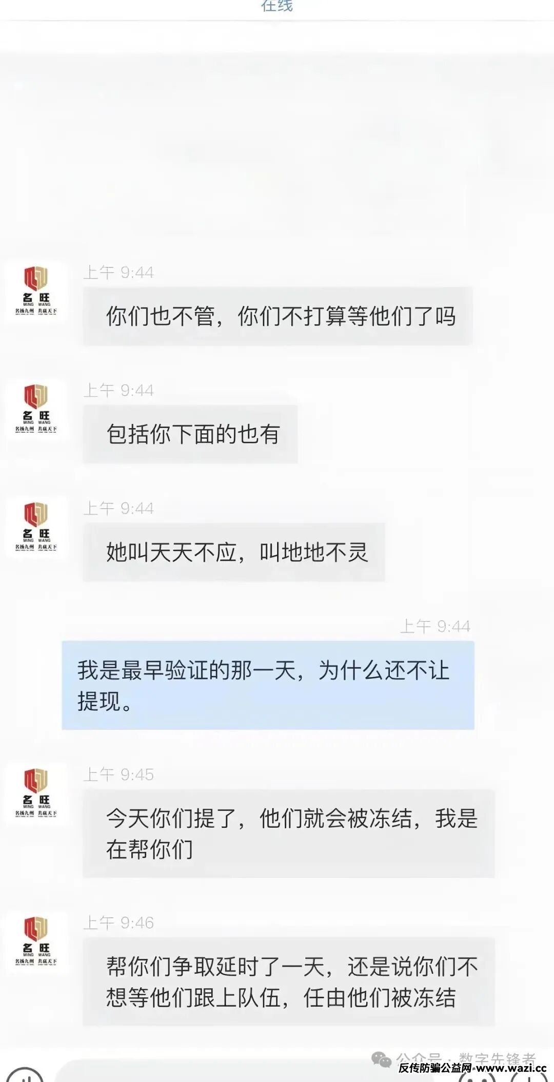 “每日收益500+,零风险躺赚”“拉人头赚佣金,合伙人福利全报销”——这些听起来诱惑力十足的宣传,正是名旺集团精心编织的诈骗陷阱。近期,这家打着“跨国投资”“股票跟单”旗号的机构...