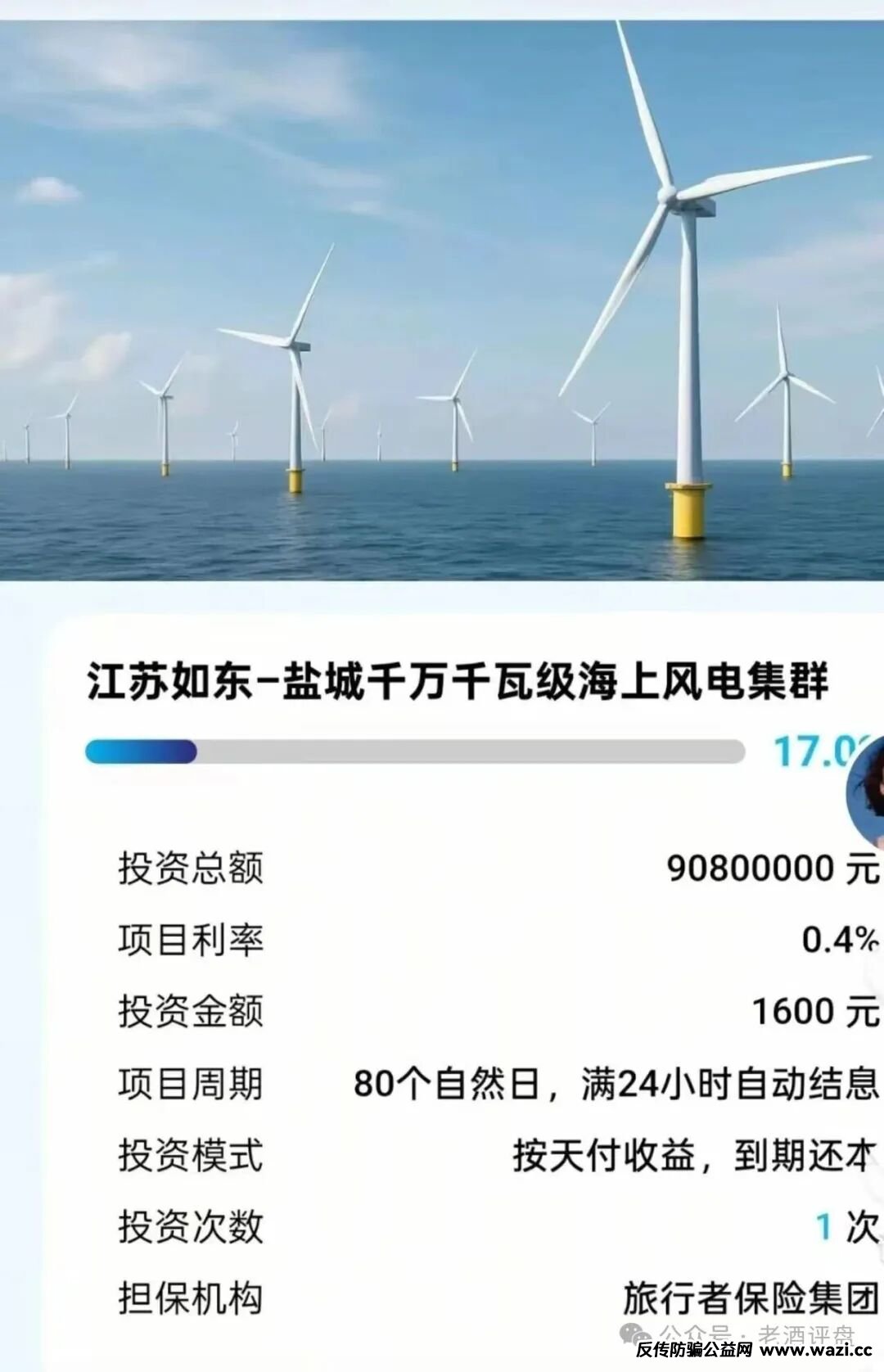 再看看这个所谓的投资利率:江苏如东、盐城的千万千瓦级海上风电集群项目,宣称需要融资 9800 万,给出日利润 0.4%、月化利润 12% 的超高回报 —— 这样离谱的高收益,真能轮得到普通投资者分一杯羹?说白了,区区 9800 万,盐城本地的有钱人随便一位都能轻松拿出,哪里需要挨家挨户拉着普通人一点点集资?核心真相很简单:项目方骗不来某一个人的 9800 万,却能靠着画大饼,骗走一群人的 1600 块!