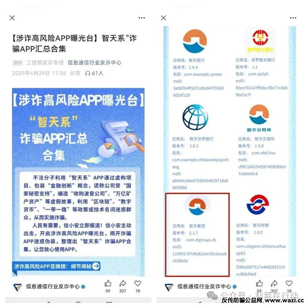 工信部反诈专班微信公众号也揭露了“智天”系诈骗APP.。
