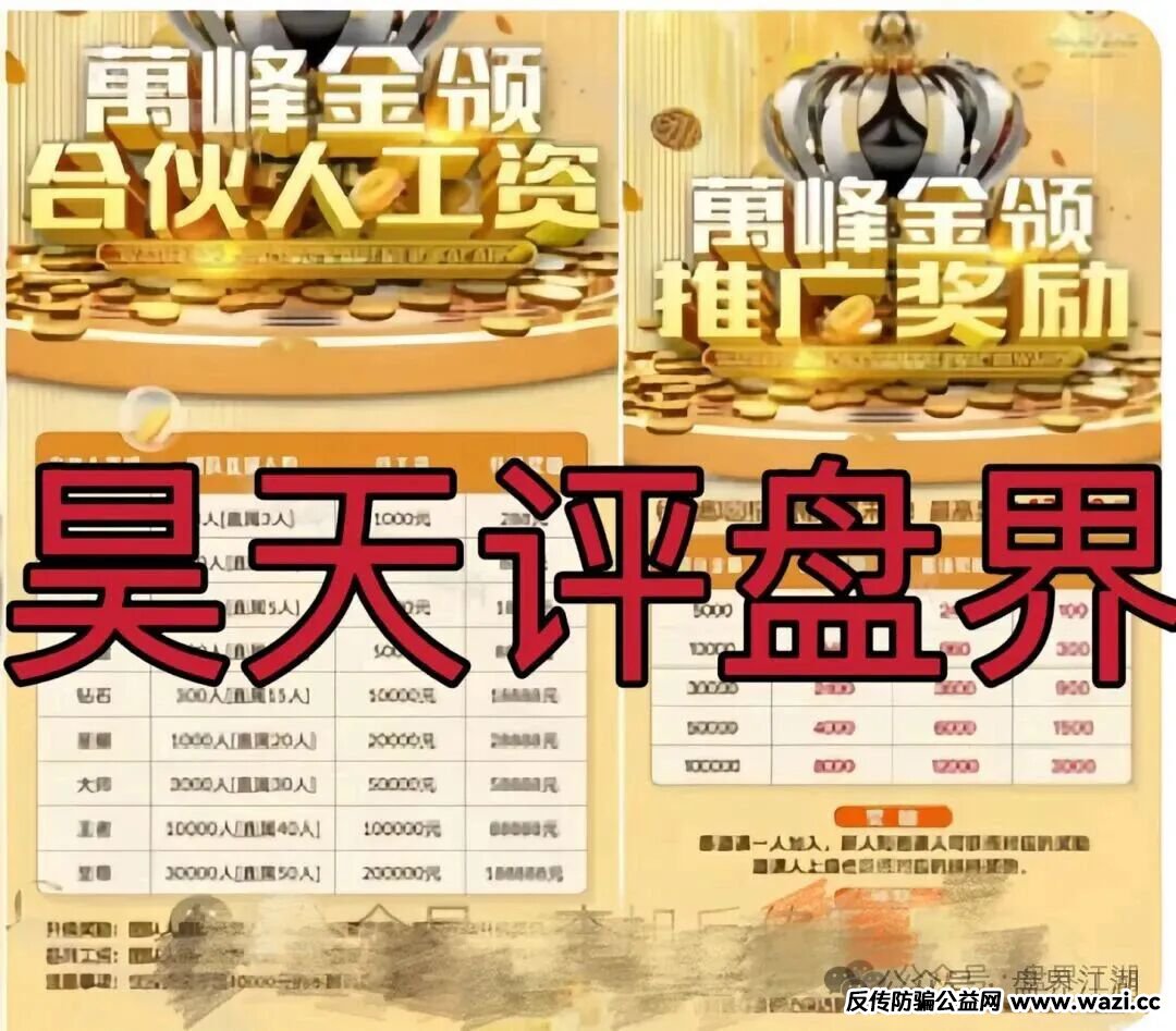 昊天评盘界友情提醒:万峰金领股票跟单类资金盘骗局,操盘手自称黄吉雄,多次单割团队,开始最后的收割套路,马上崩盘跑路!后面会持续关注!近期知乎,小红书,微博,抖音等app都有冒充昊天的诈骗团伙,记住了我们不做项目,更不会去推广任何项目,除公众号外其他一律不是本人,切勿上当受骗!