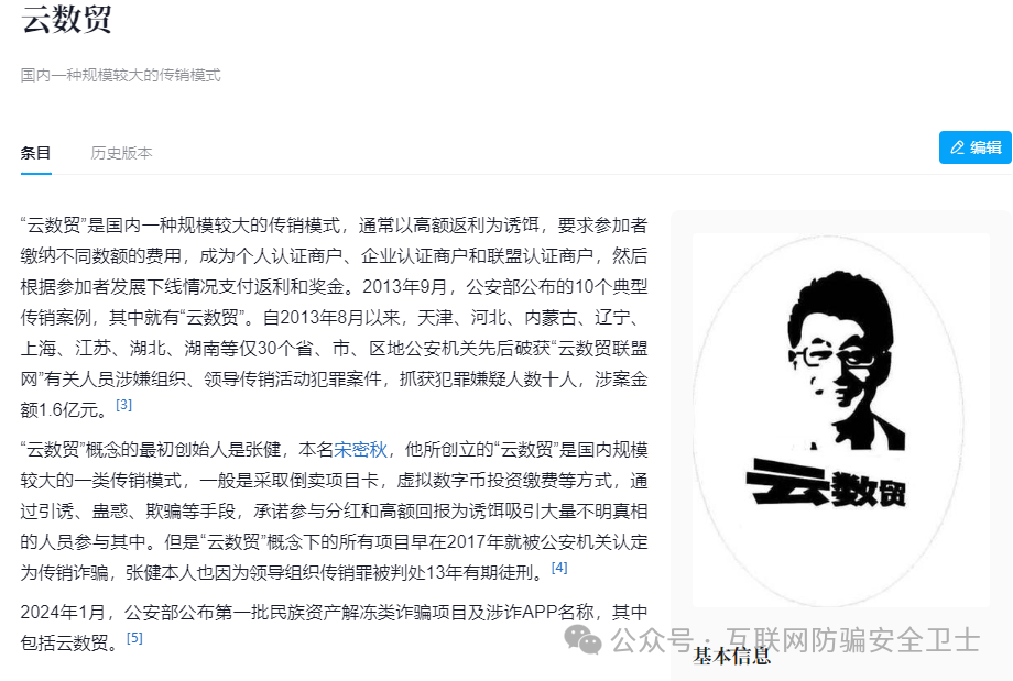 虚构境外银行项目,谎称 “报单就发 388 万元”,实为 “云数贸” 系列诈骗延伸。“云数贸” 早在 2017 年就被认定为传销诈骗,头目宋密秋(化名张健)已被判 13 年有期徒刑,涉案资金超 17 亿元,此类衍生项目均为后续收割工具。