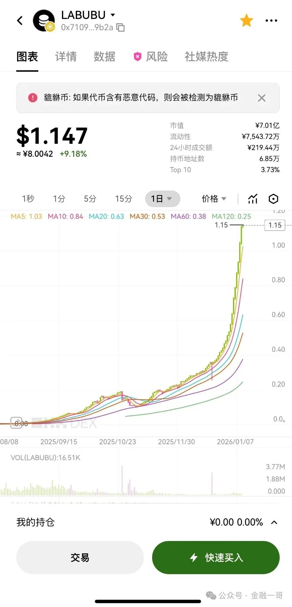 在之前的一篇文章里,我就提到过拉布布这个项目。倘若你是早期参与者,那么当下理应逐步跟随庄家撤出。目前,庄家做顶的意图十分明显,他们让项目币价每日以 10% 的涨幅攀升,以此吸引那些贪婪之人在高位进场接盘,进而实现自身的高位出货。