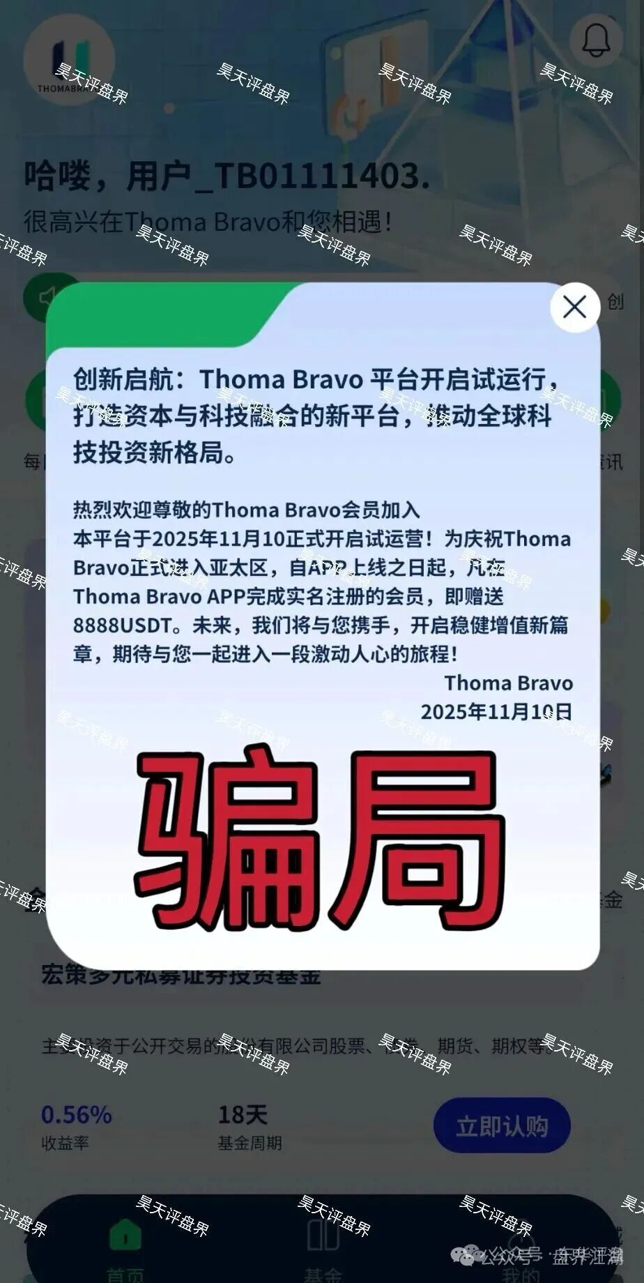 昊天评盘界:近期不少粉丝爆料了一个叫逸行团队Thoma Bravo的分红类资金盘骗局,昊天看了一下,此盘有两个app,一个叫“逸行团队”app,一个叫“Thoma Bravo”app,群聊叫“TB基金项目”群,此盘宣...